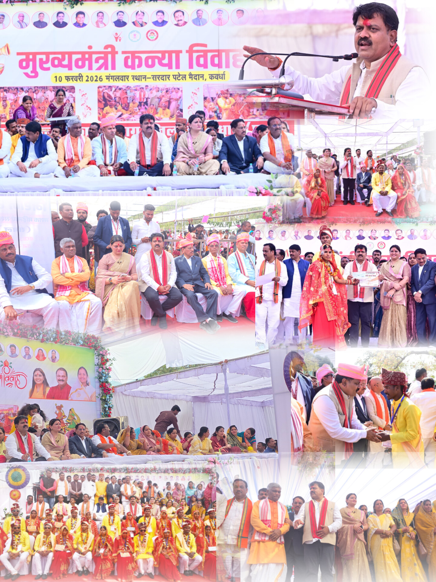 कवर्धा। मुख्यमंत्री कन्या विवाह योजना के तहत कबीरधाम जिले में सामाजिक परंपराओं और उत्साहपूर्ण वातावरण के बीच 272 जोड़ों का सामूहिक विवाह संपन्न हुआ। सरदार पटेल मैदान में आयोजित इस भव्य आयोजन में उपमुख्यमंत्री विजय शर्मा स्वयं बेटियों के अभिभावक बनकर शामिल हुए और बारात की परघौनी कर समधी की भूमिका निभाते हुए वर–वधू एवं उनके परिजनों का स्वागत किया।